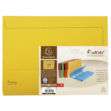 Die Aktenmappen stammen aus der Forever-Kollektion von Exacompta und sind mit dem Blauen Engel ausgezeichnet, was für ihre umweltfreundlichen Eigenschaften spricht. Sie lassen sich problemlos in Hängeregistraturen oder Archivboxen verstauen und sind somit die perfekte Lösung für eine nachhaltige, ökologische Ablage Ihrer wichtigen Unterlagen.