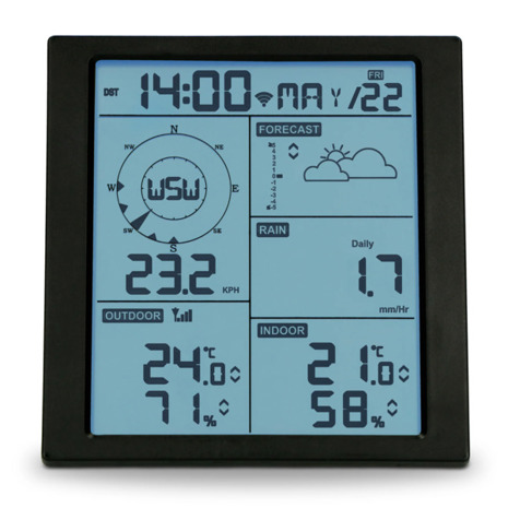 - Abmessungen Wetterstation: 20 x 46 x 11,5 cm (HxBxT) LCD Display mit 12,45 cm (4,9 Zoll) WLAN Standard: 2,4 GHz WLAN Sicherheit: WPA2-PSK Reichweite: 30 m (effektiv) / 100 m (offenes Feld)