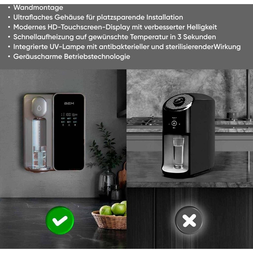 Das elegante Design in den Farben grau und schwarz fügt sich harmonisch in jede Kücheneinrichtung ein und verleiht Ihrem Raum ein modernes Ambiente. Sorgen Sie für die Gesundheit Ihrer Familie mit dem BEM K75 und genießen Sie die Vorteile von sauberem Wasser für ein besseres Leben.