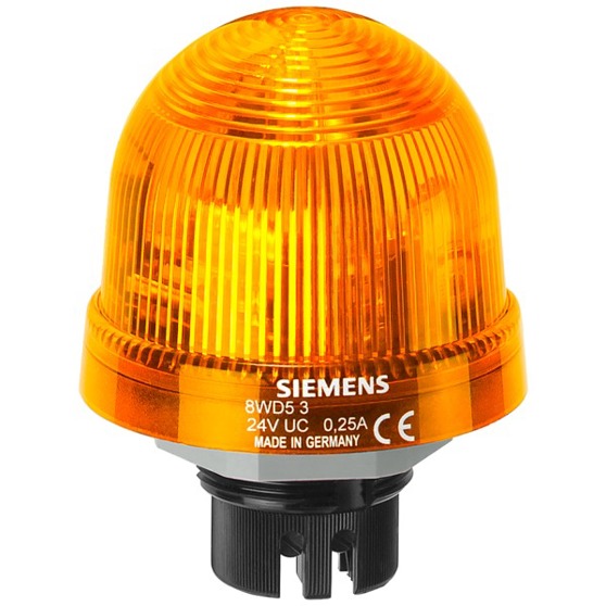 Einbauleuchte Blinklicht, mit integrierter LED, gelb, AC/DC 24 V, Durchmesser 70 mm Blinklichtelement SIRIUS 8WD5 inkl. Leuchtmittel zur visuellen Signalgebung bei rauen Umgebungsbedingungen und Anlagen im Außenbereich, z.B. zur optischen Meldung des Betriebszustandes in Fertigungsanlagen. Die Einbauleuchten sind extrem widerstandsfähig gegen Schock und Vibrationen. Ihre spezielle Formgebung ermöglicht eine optimale Abstrahlung in seitliche Richtung oder nach oben. Neben einem Dauerlicht stehen auch Blinkleuchten, Rundumleuchten sowie Blitzleuchten in verschiedenen Farben und Spannungen zur Verfügung. Als Zubehör sind Füße, Rohre, Adapter, Glühlampen, LEDs und Rohradapter erhältlich. Signalsäulen SIRIUS 8WD - Modular und kommunikationsfähig.
