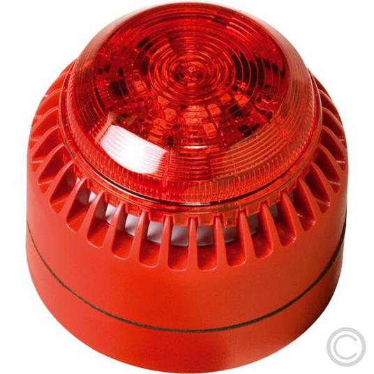 mit elektronischer Sirene, 32 wählbare Signaltöne über DIP-Schalter einstellbar, Lautstärke 98dB und elektronischer Blitzleuchte, Lichtstärke 0,5 Candela, Betriebstemperatur -10°C bis +55°C, Linse Polycarbonat, Sockel ABS-Kunststoff rot Ø93x78mm, IP54, VdS