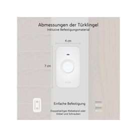 Der Klingelknopf ist durch das beiliegende Befestigungsmaterial problemlos anzubringen. Mit einer Breite von nur 4 cm passt er an nahezu jeden Türrahmen, während die Inneneinheit in jeder herkömmlichen Steckdose Platz findet. Die einfache und schnelle Installation sorgt dafür, dass Sie in wenigen Minuten bereit sind, Ihre Gäste zu empfangen.
