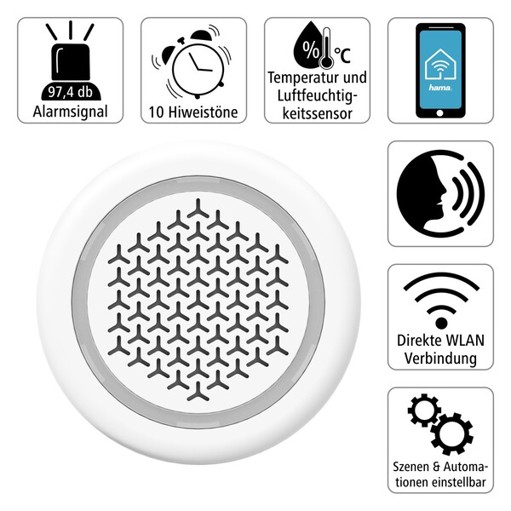 Wer schleicht so spat durch Ihren Garten zum Garagentor? Keine Angst, die 97,4 dB laute Alarmsirene warnt Sie zuverlassig und schlagt Eindringlinge in die Flucht. Koppeln Sie die WLAN-Sirene fur mehr Sicherheit zum Beispiel mit einem smarten Bewegungsmelder oder einem Tur-/Fenstersensor. - unsere Alarmsirene funktioniert ganz ohne Gateway (Hub): Sie benotigen kein zusatzliches Gerat und sparen Zusatzkosten, da die WLAN-Sirene eine Wifi-Direktverbindung zum Router herstellt - extra laut: Mit 97,4 dB vertreibt die Alarmsirene nicht nur unerwunschte Besucher, sondern der laute Alarm informiert auch sofort Sie und Ihre Nachbarn - Palim-Palim: Mit zehn unterschiedlichen Klingeltonen lasst sich die Alarmanlage als Benachrichtigungsmedium in Kombination mit anderen smarten Produkten einsetzen, z.B. Zeit zum Luften, beim Eintritt in ein Ladengeschaft - fur ein besseres Raumklima: Sensoren fur Temperatur und Luftfeuchtigkeit unterstutzen Sie gemeinsam mit der Hama Smart Home-App beim richtigen Luften und Heizen - Schritt fur Schritt zum Smart Home: Mit der Hama Smart Home-App konnen Sie Ihr smartes Zuhause um beliebig viele Hama Smart-Home-Produkte erweitern und vernetzen - mit der Hama Smart Home-App verschiedenste Alarmszenarien erstellen und bequem uber die App oder per Sprachbefehl aktivieren oder deaktivieren - Alarmsirene mit Extras: fur mehr Sicherheit im smarten Zuhause sowie mehr Unterstutzung dank verschiedener Benachrichtigungs-Klingeltone in Verbindung mit anderen Smart-Home-Systemen- einfache Installation ins eigene WiFi-Netzwerk: Da kein Hub benotigt wird, haben Sie Ihre Gerate innerhalb weniger Minuten eingerichtet - hohe Kompatibilitat: funktioniert mit Amazon Alexa, Google Assistant, Amazon Echo Show und Google Nest Hub, iOS und Android, zudem lassen sich alle mit Alexa- und Google-Assistant-kompatiblen Smart-Home-Produkte anderer Hersteller verknupfen - die perfekte Erganzung: Der WLAN-Alarm eignet sich ideal, um Wohnung oder Haus intelligent zu erweitern, korperlich beeintrachtigte Menschen profitieren von einer Programmierung auf gezielte Sprachbefehle, z.B. Alarm, wenn Hilfe benotigt wird - vielfaltig einsetzbar als Alarm: z.B. in Verbindung mit einem smarten Tur-Fenster-Kontakt - wenn Kellertur oder Fenster unbefugt geoffnet werden, schrillt der Alarm los, Alarmdauer einstellbar - vielfaltig einsetzbar als Hinweisgeber: verschiedene Klingeltone einstellbar, z.B. Waschmaschine an WLAN-Steckdose – es ertont der ausgewahlte Ton, wenn die Waschmaschine fertig ist; fur Morgenmuffel als Wecker einsetzbar - fur ein besseres Raumklima: Legen Sie in der Hama Smart Solution-App Werte fur Luftfeuchtigkeit und Temperatur fest. Werden diese uber- oder unterschritten, ertont der Klingelton - akustisches und optisches Signal: zusatzlich zum akustischen Alarm leuchtet ein rotes LED-Blinklicht - fur Innenraume geeignet - Ihre Daten werden ausschlieslich auf deutschen Servern gelagert Systemvoraussetzung: - Betriebssystem: Android 6 und iOS 11.0 oder hoher Lieferumfang: - 1 smarte Alarmsirene - 1 USB-Kabel - Montagematerial - 1 Kurzbedienungsanleitung