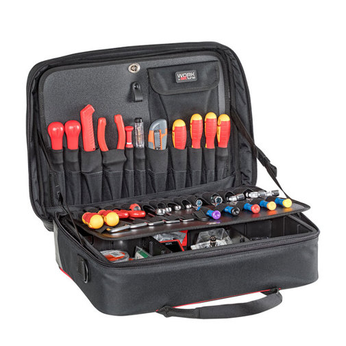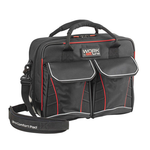 Für höchsten Komfort während des Transports ist die Arbeitstasche mit einem gepolsterten Schulter-Tragegurt ausgestattet, der sich zudem an Ihre Körpergröße anpassen lässt. Die ergonomisch gestalteten Griffe sind ebenfalls mit Neopren gepolstert, was das Tragen über längere Strecken angenehm macht. Bitte beachten Sie, dass die abgebildeten Werkzeuge nicht im Lieferumfang enthalten sind.