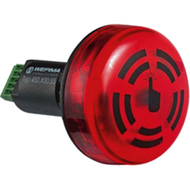 Signalgeberkombinationen LED/Summer mit Quittierung Typ Werma 450. LED-Dauerleuchte mit zuschaltbarem Dauerton. Störungen werden durch ein optisches oder optisch-akustisches Signal angezeigt, abschalten des akustischen Signals durch leichtes Drücken; Lautstärke: 80 dB, Lebensdauer: 50.000 h (Akustik min. 5000 h), Gehäuse: PC/ABS-Blend, Temperaturbereich: –20 bis +50 °C, Stromaufnahme: < 80 mA, Schutzart: IP 65, Maße: Ø 49, H 80 mm, Montagebohrung: Ø 22,5 mm Mit AS-Interface-Bus. Versorgung AS-Interface: über Bus-Leitung, Betriebsspannung 25 bis 31,5 V (gemäß AS-Interface-Spezifikation), Quittierfunktion mit Rückmeldung der Summerabschaltung über AS-Interface-Bus, Dauerton: 2,8 kHz, Anschlüsse: Schraubklemmen mit Drahtschutz (max. 1,5 mm²). Typ: 450 110 55, 30 VDC, rot