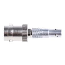 Adapter, 00-Stecker auf BNC-Steckverbinder. Adapter bestehend aus einem Lemo-Stecker der Serie 00 und einem BNC-Steckverbinder für 50 Ω vom Typ UG 89/U (Buchse).