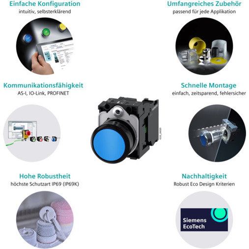 Leuchtmelder, 22 mm, rund, Kunststoff, gelb, Linse, glatt, mit Halter, LED-Modul, MIT INTEGRIERTER LED AC/DC 24V, Federzuganschluss Leuchtmelder SIRIUS ACT zur Signalisierung von Schaltzuständen oder Störungen in Anlagen mit brillianter Leuchtkraft dank energieeffizienter LED-Technologie. Unter dem Markennamen SIRIUS ACT bietet Siemens ein einzigartiges Portfolio an Befehls- und Meldegeräten mit weltweiten Produkt-Zulassungen in drei modernen Designreihen aus robustem Echtmetall und hochwertigem Kunststoff.Das innovative Aufschnappkonzept vereinfacht die Montage so weit, dass dafür nur eine Hand und kein Spezialwerkzeug erforderlich ist. Als Montagebohrungen genügen nutfreie Löcher, da bereits ein 100%iger Verdrehschutz integriert ist.Dank der durchgängig hohen Schutzart sind die robusten Geräte industrietauglich und für den Außeneinsatz geeignet. Sogar die Reinigung mit Hochdruckstrahl ist möglich. Weder Staub, Öle noch aggressive Laugen können den zuverlässigen Betrieb stören.Neben der Standardverdrahtung können die meisten Geräte auch über PROFINET, AS-Interface oder IO-Link an die Steuerung angebunden werden. Damit reduzieren Sie Ihren Verdrahtungsaufwand, minimieren Fehlerquellen und gewinnen mehr Flexibilität.Komfortabel unterstützt der grafische Online-Konfigurator bei Auswahl und Bestellung von Einzelgeräten, Gehäusen und Beschriftungen. Umfangreiche Dokumentation (z.B. Handbuch, 3D-Daten, Anschlussdiagramm) ist verfügbar. Lieferbare Ausführungen: mehrere Farben, verschiedene Spannungsvarianten. Hinweis: Komplettgerät, Lieferung inklusive Halter und Module. SIRIUS ACT - Performance in Action beim Befehlen und Melden. Einfach montiert, einfach stark, einfach perfekt.