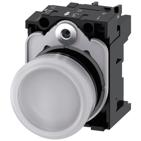 Leuchtmelder, 22 mm, rund, Kunststoff, weiß, Linse, glatt, mit Halter, LED-Modul, MIT INTEGRIERTER LED AC/DC 24V, Schraubanschluss Leuchtmelder SIRIUS ACT zur Signalisierung von Schaltzuständen oder Störungen in Anlagen mit brillianter Leuchtkraft dank energieeffizienter LED-Technologie. Unter dem Markennamen SIRIUS ACT bietet Siemens ein einzigartiges Portfolio an Befehls- und Meldegeräten mit weltweiten Produkt-Zulassungen in drei modernen Designreihen aus robustem Echtmetall und hochwertigem Kunststoff.Das innovative Aufschnappkonzept vereinfacht die Montage so weit, dass dafür nur eine Hand und kein Spezialwerkzeug erforderlich ist. Als Montagebohrungen genügen nutfreie Löcher, da bereits ein 100%iger Verdrehschutz integriert ist.Dank der durchgängig hohen Schutzart sind die robusten Geräte industrietauglich und für den Außeneinsatz geeignet. Sogar die Reinigung mit Hochdruckstrahl ist möglich. Weder Staub, Öle noch aggressive Laugen können den zuverlässigen Betrieb stören.Neben der Standardverdrahtung können die meisten Geräte auch über PROFINET, AS-Interface oder IO-Link an die Steuerung angebunden werden. Damit reduzieren Sie Ihren Verdrahtungsaufwand, minimieren Fehlerquellen und gewinnen mehr Flexibilität.Komfortabel unterstützt der grafische Online-Konfigurator bei Auswahl und Bestellung von Einzelgeräten, Gehäusen und Beschriftungen. Umfangreiche Dokumentation (z.B. Handbuch, 3D-Daten, Anschlussdiagramm) ist verfügbar. Lieferbare Ausführungen: mehrere Farben, verschiedene Spannungsvarianten. Hinweis: Komplettgerät, Lieferung inklusive Halter und Module. SIRIUS ACT - Performance in Action beim Befehlen und Melden. Einfach montiert, einfach stark, einfach perfekt.