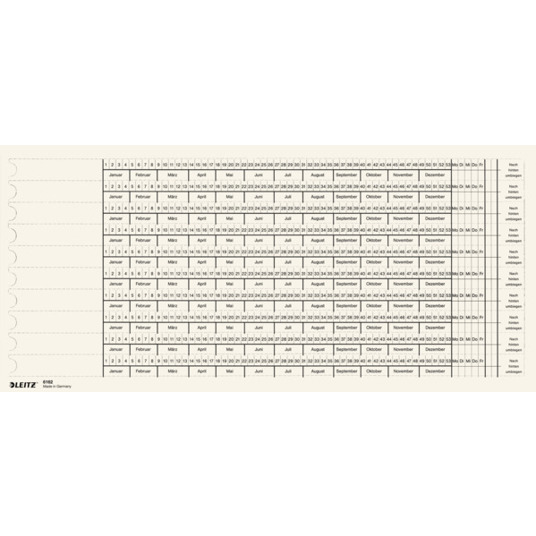 Die Vorderseite der Streifen zeigt eine übersichtliche Skala von 1 bis 53, unterteilt in Wochentage (Mo.-Fr.) sowie Monate (Jan.-Dez.), was Ihnen eine schnelle und einfache Zuordnung Ihrer Dokumente ermöglicht. Die Rückseite ist blanko und bietet Ihnen die Flexibilität, eigene Notizen oder Hinweise zu vermerken.