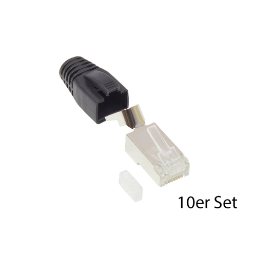 - Lieferumfang: 10x Geschirmter RJ45 Stecker, 10x Einfädelhilfe, 10x Knickschutztülle (Farbe: Schwarz)