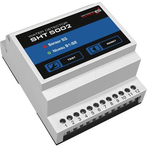 Der Wassermelder SHT 5002 ist ein Gerät zur Niveauregelung (2-Punkt-Regler). Über zwei Wassersensoren oder Schwimmschalter wird ein oberes und ein untereres Niveau definiert und kann zum automatischen Befüllen oder Entleeren eines Behälters verwendet werden. Ein potenzialfreier Relaiskontakt dient zur Ansteuerung der Pumpe (Relais K1 Niveau: max. 5 A / 230 V; Relais K2 Überlauf: max. 5 A / 230 V).