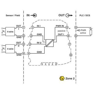 Ausgangsseitig gespeister 2-Wege Loop-Powered-Trennverstärker, über DIP-Schalter konfigurierbar, mit Schraubanschlusstechnik, Standardkonfiguration.
