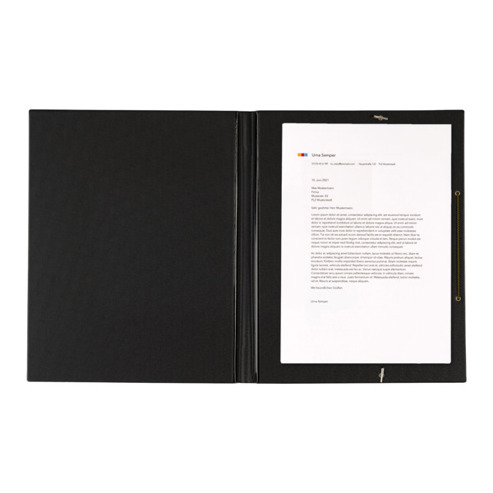 Die elegante schwarze Farbe verleiht der Mappe ein professionelles Erscheinungsbild, ideal für jeden Arbeitsplatz. Sie ist so konzipiert, dass sie Platz für ca. 300 DIN A4-Blätter bietet, sodass Sie alle wichtigen Unterlagen an einem Ort aufbewahren können. Mit einem praktischen Eckspannergummi bleibt der Inhalt immer sicher und ordentlich an seinem Platz.